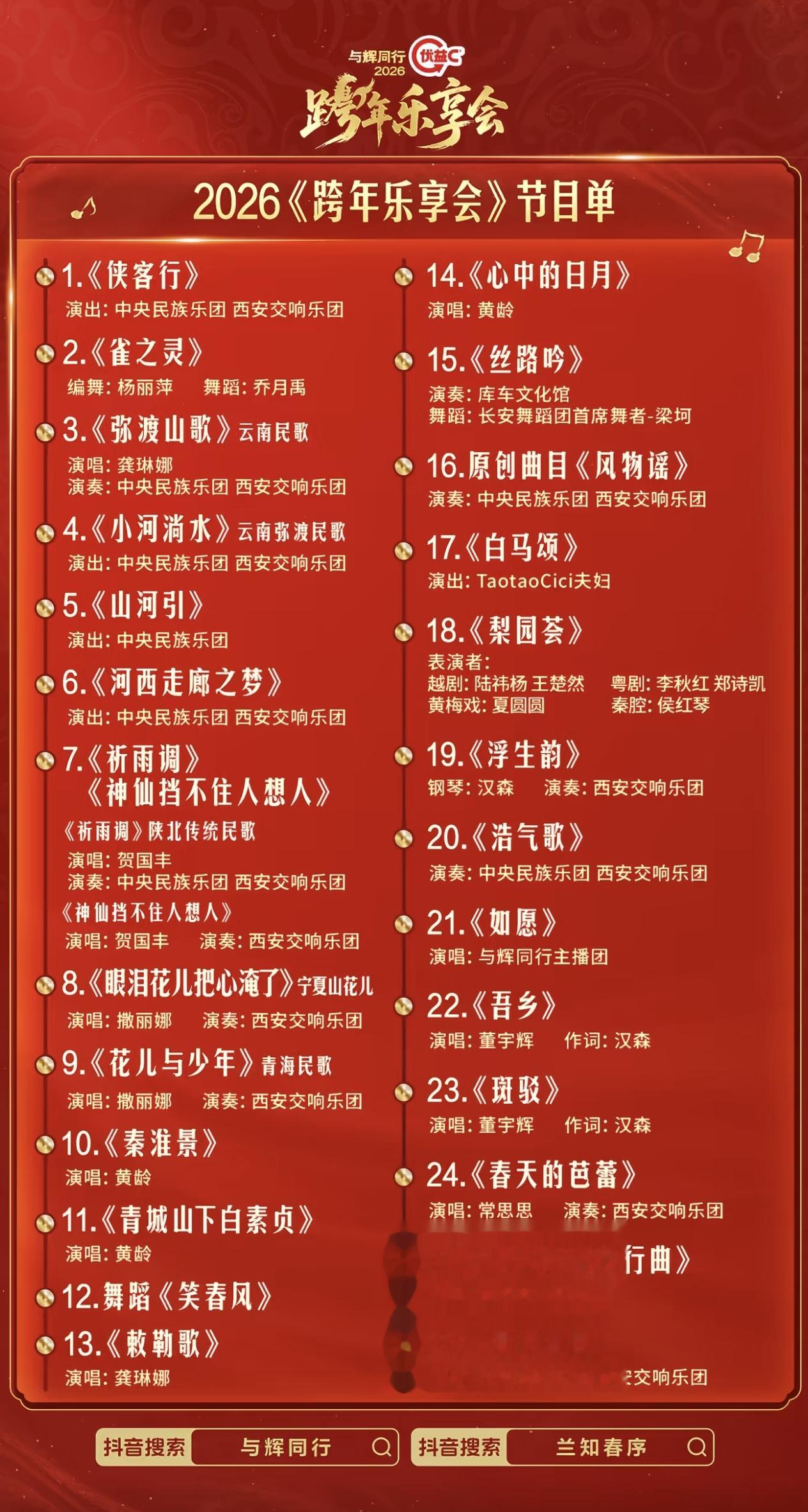 而今天31号还有一个更备受大家期待的重头戏,那无疑就是今晚21点30分正式开播的“2026跨年乐享会”。就在今天上午与辉同行小编也发布了今晚这台跨年乐享会的节目单,看到这份足足有26个节目之多的节目单,相信今晚准备看这台跨年晚会的朋友一定会更加期待。