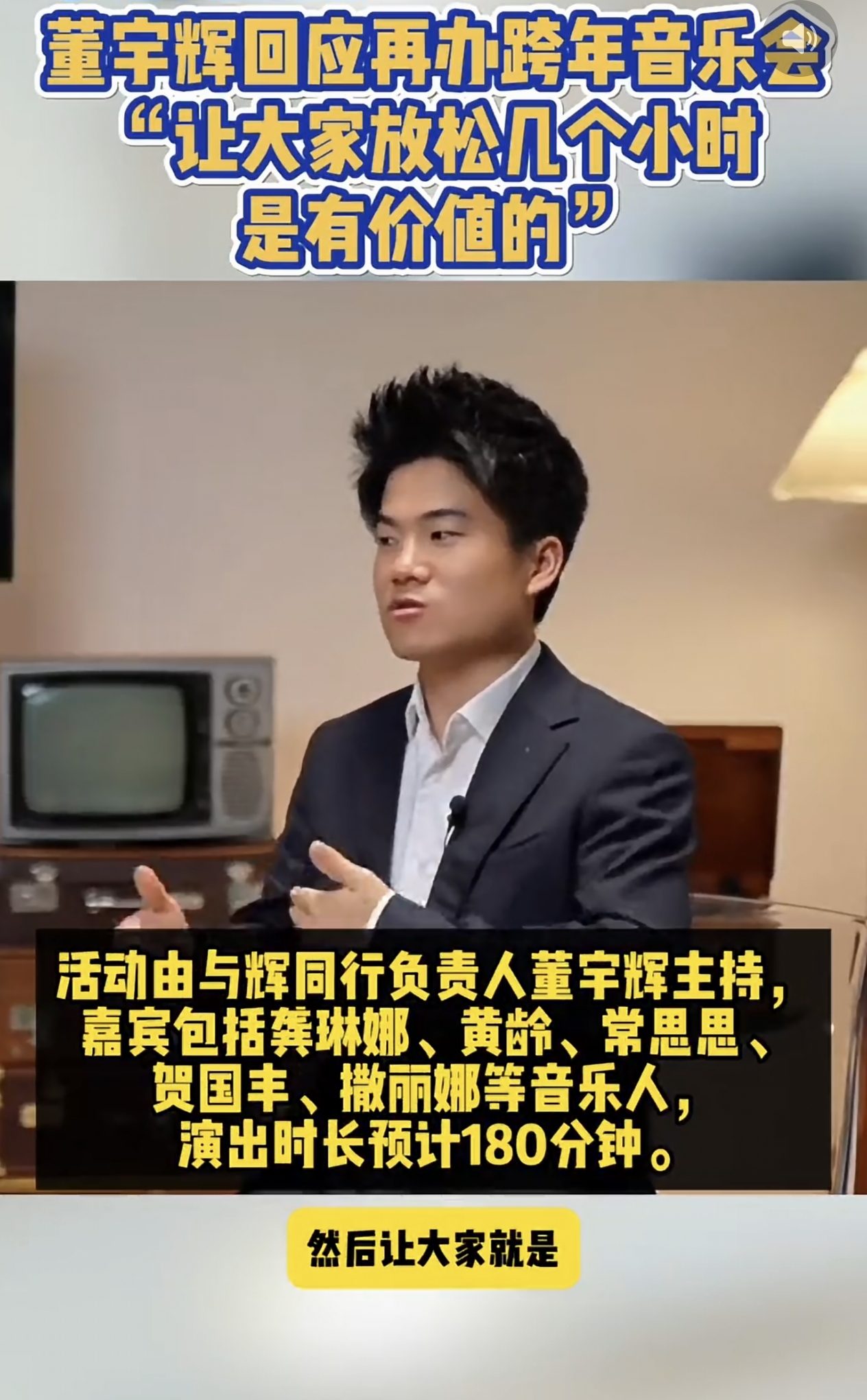 因为这节目类型可是太丰富了,包含了交响乐、传统民歌、舞蹈和流行歌曲等琳琅满目,其中宇辉本人更是会演唱两首他的个人单曲。还有几位龚琳娜、贺国丰、黄龄和撒丽娜等几位大咖嘉宾歌手都会分别演唱两到三首歌曲,所以看完这个节目单后,对今晚的这台跨年乐享的精彩程度和期待值更是直接拉满!