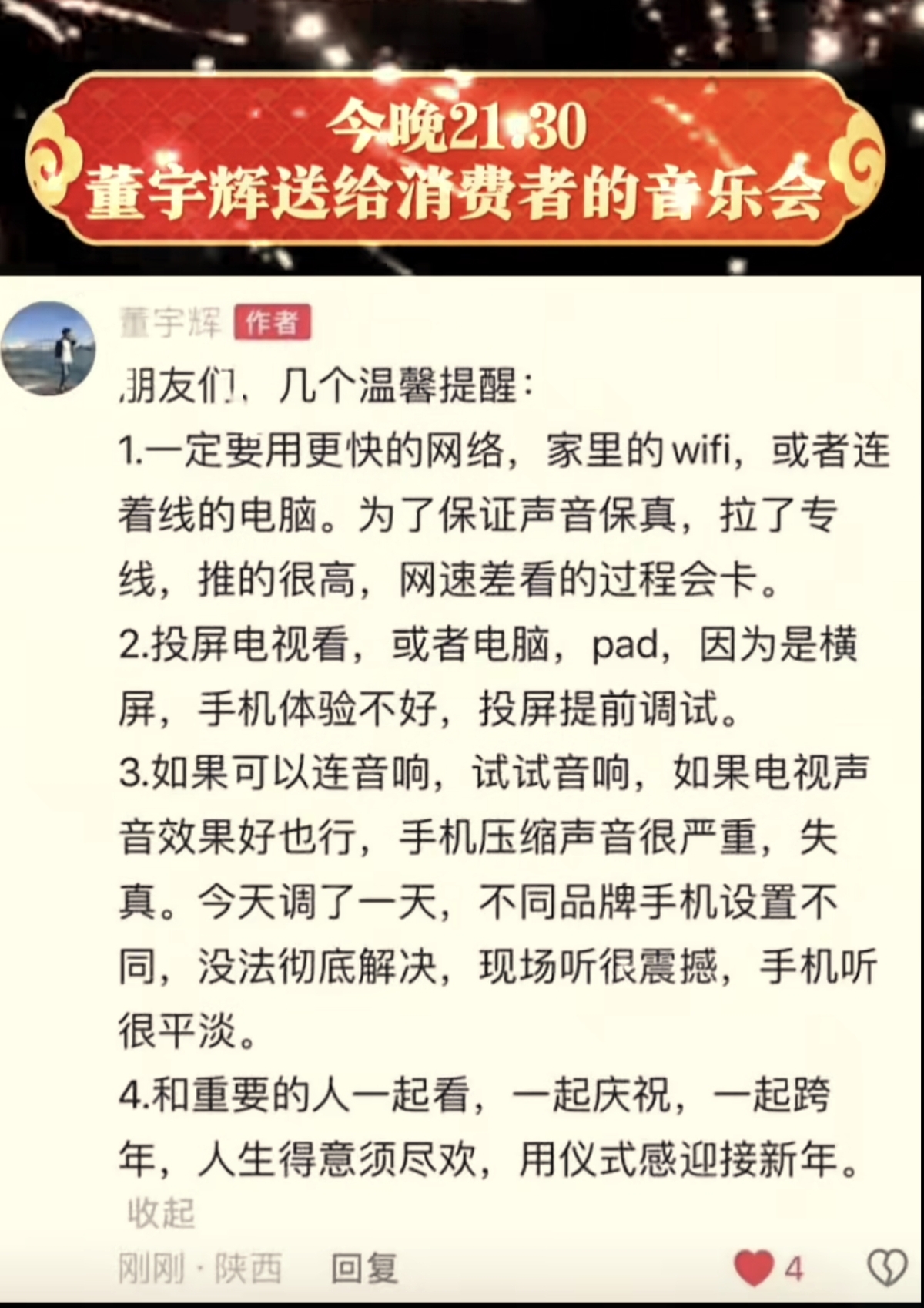 宇辉为了让大家今晚能更好地收看这台精彩的跨年晚会,更是细心地在评论区地给大家写了四条温馨提醒,只见宇辉写道:“