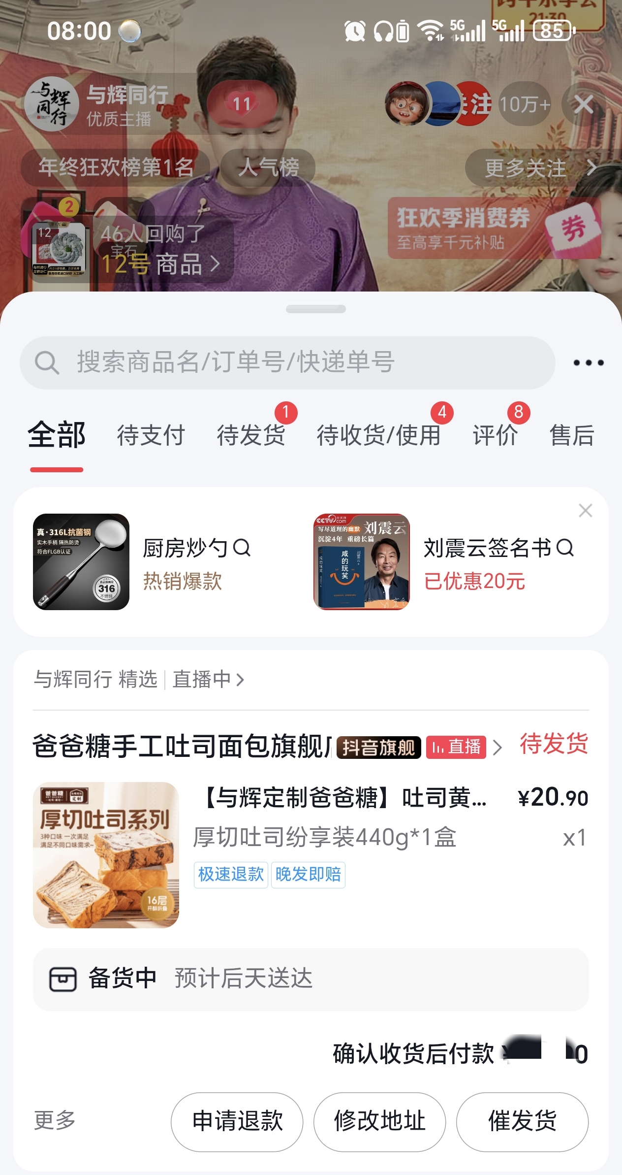 据董董透露,今天早上在线人数最高峰的时候高达43万人,而当天早上上架的定制吐司只有15万单,所以注定还是得有二十八九万人是抢不到这款定制吐司的,但今天早上小编还是蛮幸运的,一进去直播间刷新了两次链接就抢到了,也算是今天43万人里的其中一个幸运儿吧。