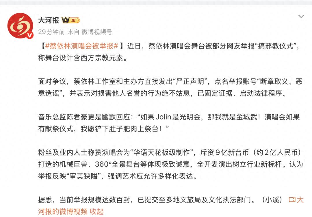 面对争议,蔡依林工作室和主办方直接发出“严正声明”,点名举报账号“断章取义、恶意造谣”,并表示对损害他人名誉的行为绝不姑息,已固定证据、启动法律程序。 音乐总监陈君豪更是幽默回应:“如果Jolin是光明会,那我就是金城武!演唱会如果有献祭仪式,我愿铲下肚子肥肉上祭台!” 粉丝及业内人士称赞演唱会为“华语天花板级制作”,斥资9亿新台币(约2亿人民币)打造的机械巨兽、360°全景舞台等体现极致诚意,全开麦演出树立行业新标杆。认为举报反映“审美狭隘”,强调艺术应允许多样化表达。 据悉,当前举报规模达数百封,已提交至多地文旅局及文化执法部门。