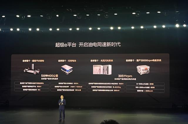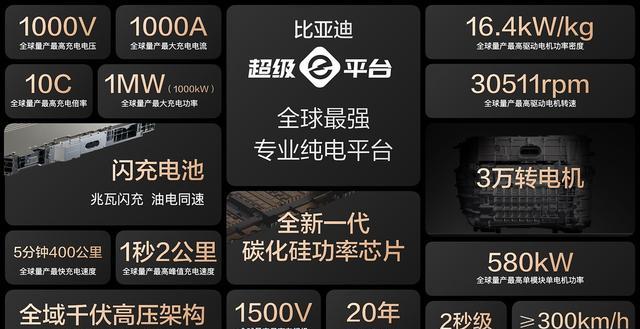 首先聊聊比亚迪此次亮相的超级e平台,因为唐L EV就是基于该平台打造,像闪充电池、碳化硅功率芯片、3万转电机等技术都会上车。根据官方公布数据,基于该平台打造的车型会带来2秒级百公里加速体验,最高车速将超过300km/h,同时实现1秒钟充电2公里,所以5分钟即可补充400km续航。如果按照当下800V架构等标准来换算,超级e平台等于是1000V架构,因为它将带来1000V最高充电电压、1000A最大充电电流、1000千瓦充电功率以及10C最高充电倍率。
