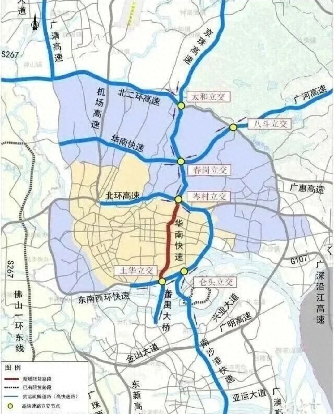 华南快速一期全长15.6公里,双向八车道,南接番禺大桥、北靠岑村立交桥,在串联起番禺区与海珠区和天河区之后,于1999年通车,至今已经有20多年的历史了。