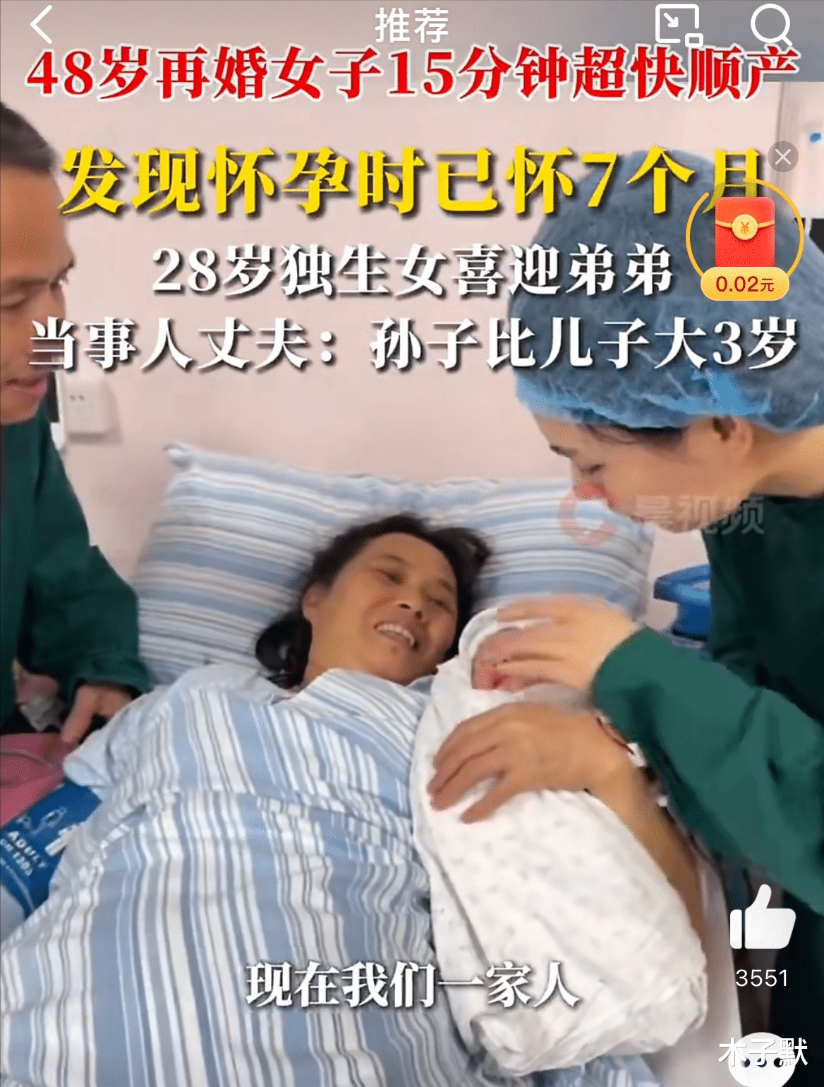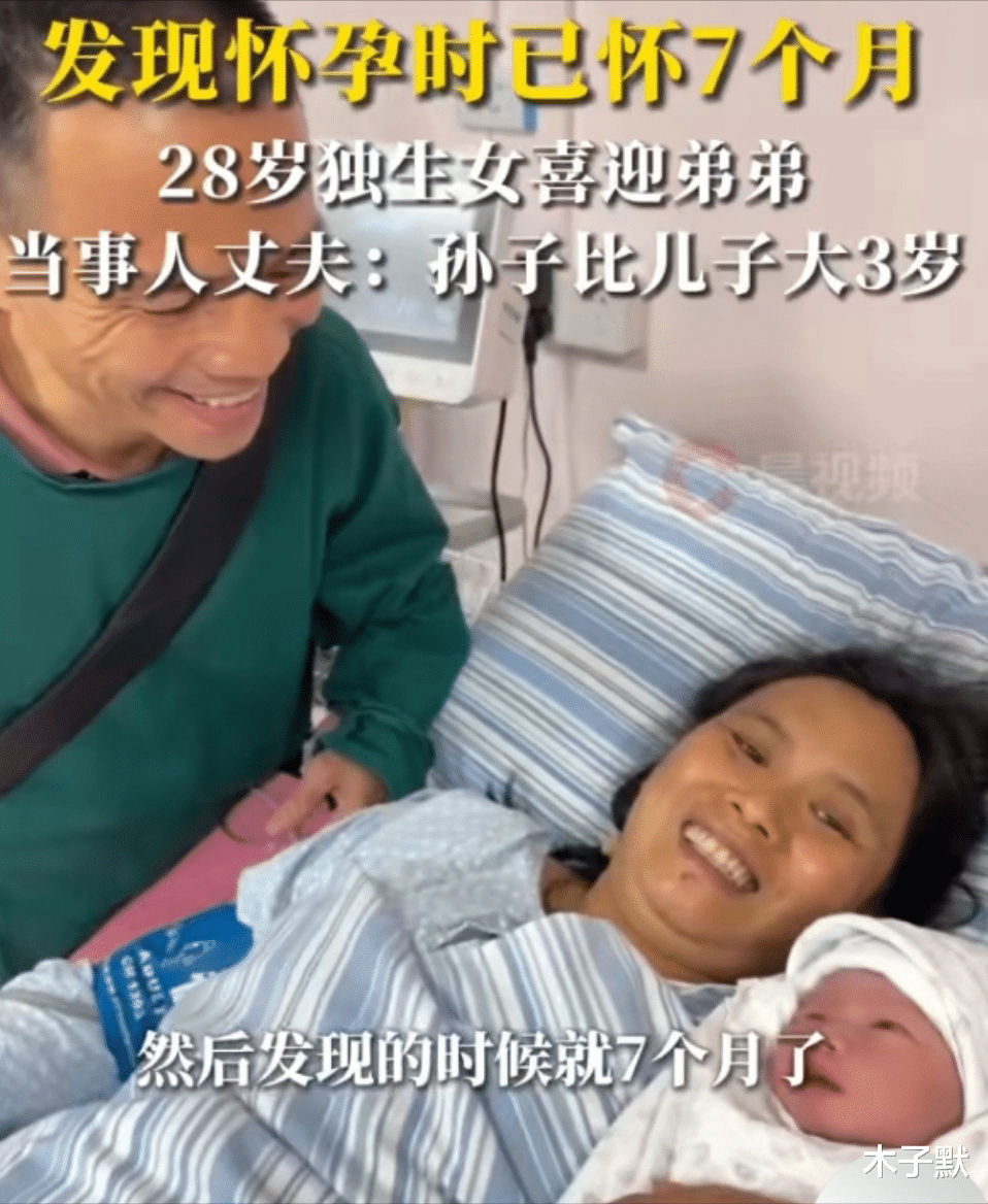 48岁再次当妈妈,28岁的女儿迎来弟弟,丈夫也幽默透露孙子比儿子大3岁。