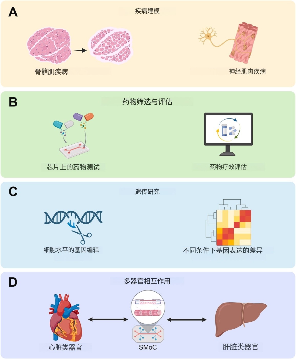 图。SMoC 的应用。A) SMoC 在疾病建模中的应用。B) SMoC 在药物筛选与评价中的应用。C) SMoC 用于遗传研究。D) SMoC 用于研究骨骼肌与其他器官的相互作用。