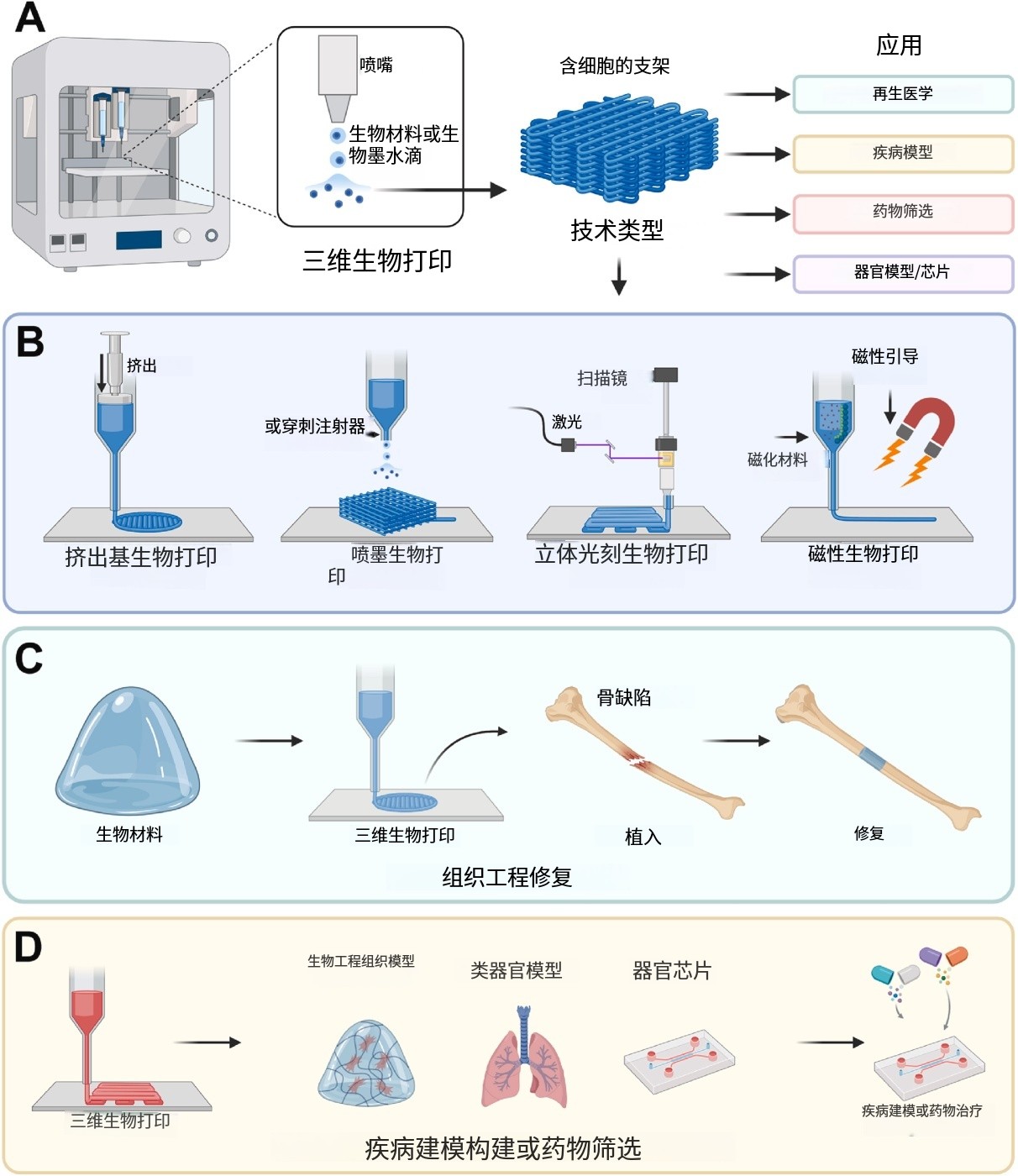 图. 3D 生物打印的类型和应用。A.3D 生物打印的示意图。B.主要的 3D 生物打印类型。C.3D 生物打印在组织工程修复中的应用。D.3D 生物打印在疾病模型构建和药物筛选中的应用。