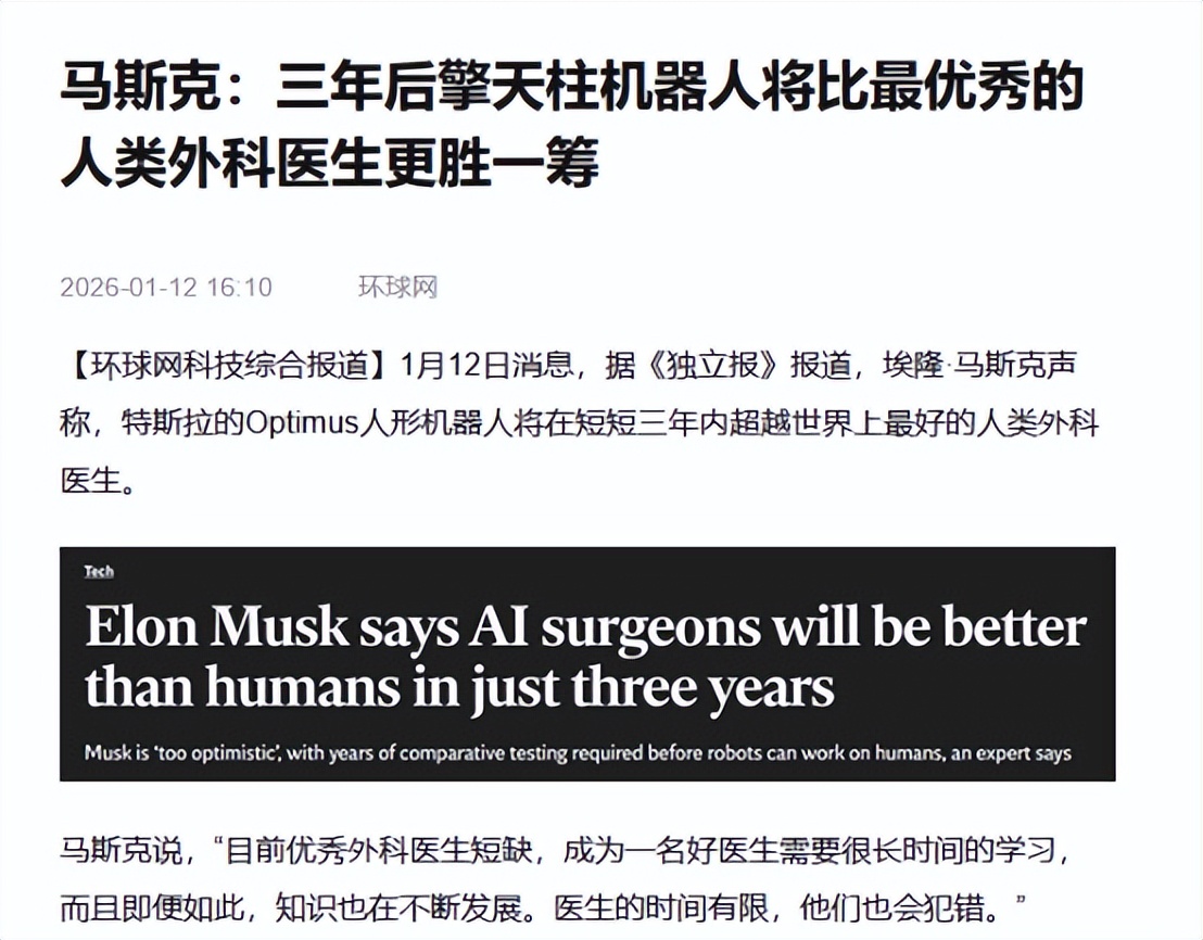 更让人咋舌的,马斯克这次把手伸向了门槛极高的医疗行业,本来大家觉得医生这种需要高度专业和经验的职业挺稳当,结果马斯克说,也就三五年的事。