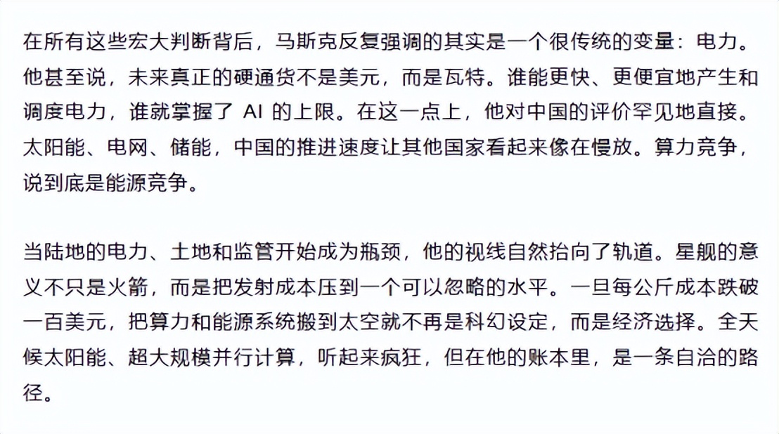 而在他的规划里,未来的硬通货不是美元,而是代表能量的瓦特,为了解决能源和算力场地的问题,马斯克甚至想把数据中心发射到天上去。