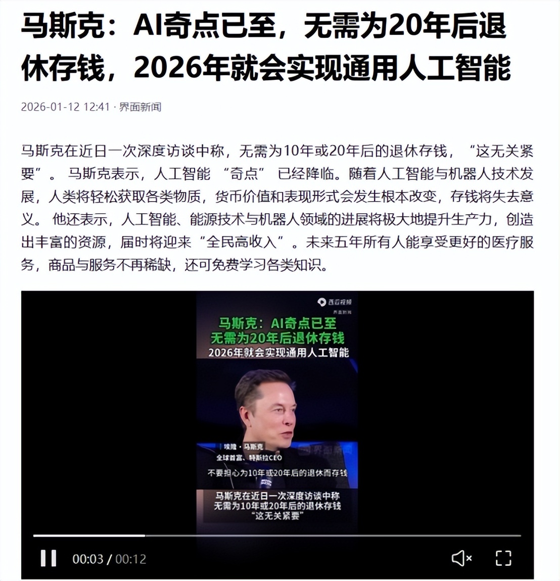 澎湃新闻2026-01-13 马斯克最新访谈,瓦特是未来货币,电力优势将令中国AI算力一骑绝尘