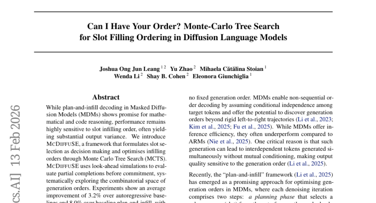 这项由帝国理工学院和爱丁堡大学联合开展的研究发表于2026年,论文编号为arXiv:2602.12586v1,为人工智能写作带来了一个重要突破。研究团队开发了一种名为MCDIFFUSE的新方法,让AI能够像人类一样进行"计划后填空"的智能写作。
