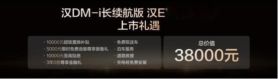 此次,汉DM-i长续航版共推出4款车型,补贴后售价15.98万~18.98万元;汉EV长续航版共推出3款车型,补贴后售价17.38万~20.58万元(10月31日前完成购车可享1万元超级置换补贴)。同时,比亚迪还为用户准备了包含置换补贴在内的至高价值3.8万元七大礼遇。