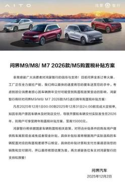 值得一提的是,面对即将到来的年末购车季,问界还推出购置税补贴方案:凡在2025年12月1日00:00至2025年12月31日24;00前完成大定锁单的用户,如因非用户原因导致车辆在2026年交付,即可享受至高15000元的购置税补贴,让消费者能够毫无顾虑地把握年末购车良机。