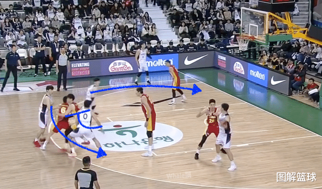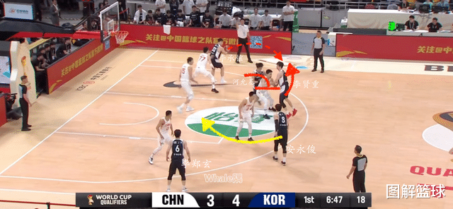 了解了该战术的基础打法后,开始看韩国男篮在与中国男篮的两场对决中,如何使用该战术创造得分机会的。