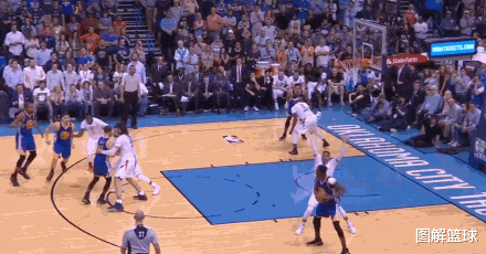 外线射手带动之下,掩护人也可以空切得分。如上图,库里带走防守后,原本是掩护人的鲁尼迅速空切接追梦传球后完成扣篮。