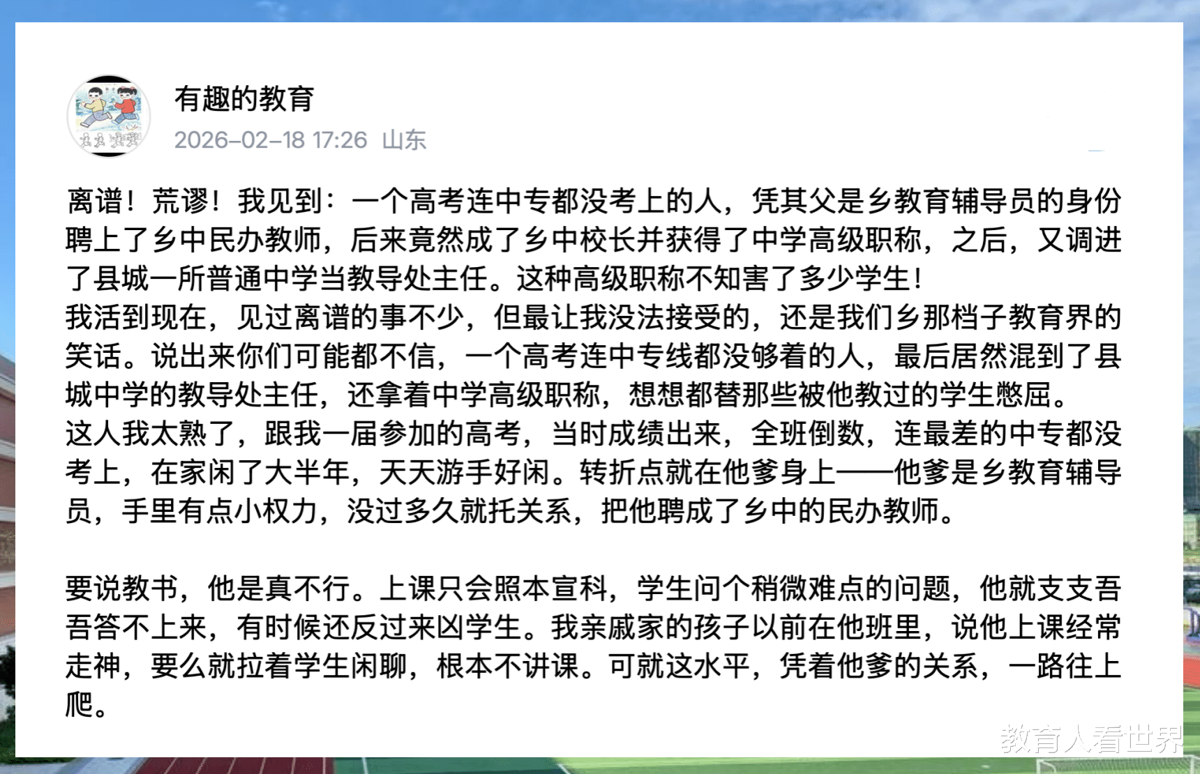 一个连中专线都没够着的落榜生,就因为爹是乡教育辅导员,转头就进了乡中当民办老师。最绝的是,这人上课只会念课本,学生问深点就急眼,亲戚家孩子都被他凶过。可就这水平,评职称一路绿灯,高级职称到手,乡中校长也当上了,最后还调进县城管教学。