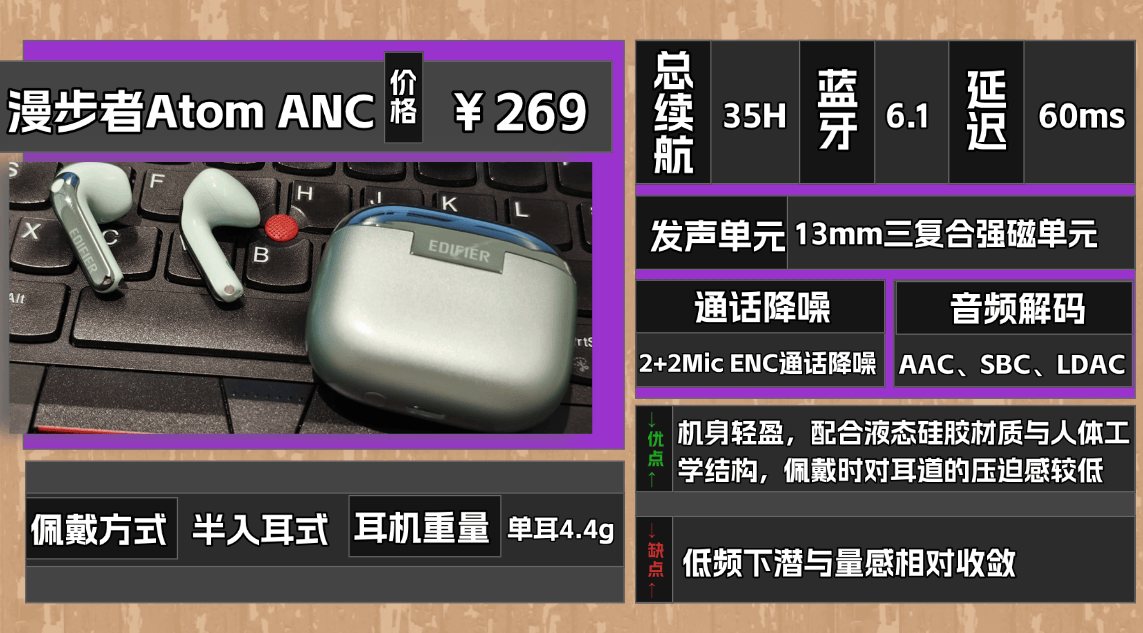 综合实力品牌⑨ 漫 步者A tom ANC蓝牙耳机
