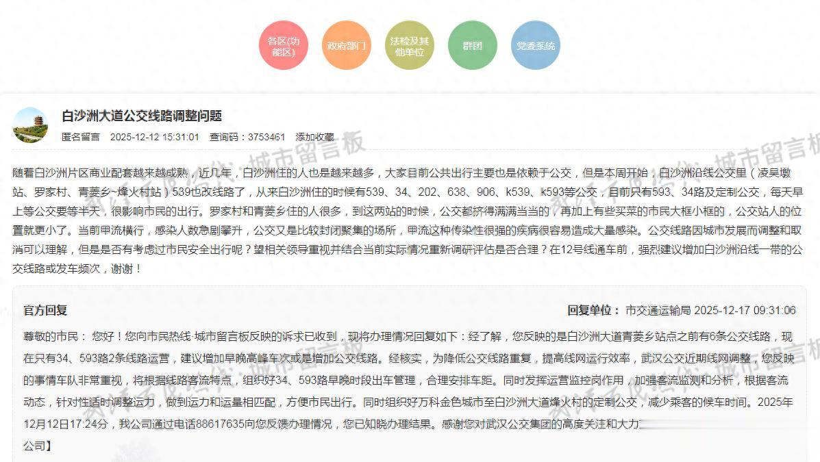 网友反馈 随着白沙洲片区商业配套越来越成熟,近几年,白沙洲住的人也是越来越多,大家目前公共出行主要也是依赖于公交,但是本周开始,白沙洲沿线公交里(凌吴墩站、罗家村、青菱乡~烽火村站)539也改线路了,从来白沙洲住的时候有539、34、202、638、906、k539、k593等公交,目前只有593、34路及定制公交,每天早上等公交要等半天,很影响市民的出行。罗家村和青菱乡住的人很多,到这两站的时候,公交都挤得满满当当的,再加上有些买菜的市民大框小框的,公交站人的位置就更小了。当前甲流横行,感染人数急剧攀升,公交又是比较封闭聚集的场所,甲流这种传染性很强的疾病很容易造成大量感染。公交线路因城市发展而调整和取消可以理解,但是是否有考虑过市民安全出行呢?望相关领导重视并结合当前实际情况重新调研评估是否合理?在12号线通车前,强烈建议增加白沙洲沿线一带的公交线路或发车频次,谢谢!