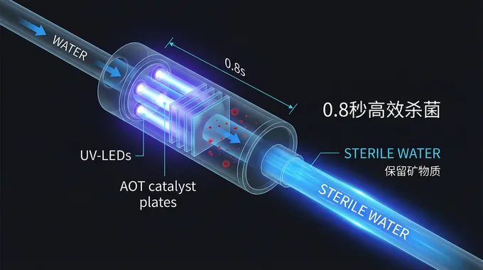 为什么虎鲸妈妈能做到如此极致的节能?答案藏在其核心的AOT光催化技术中。不同于传统净水机依赖高压泵强行将水挤过膜孔的物理暴力方式,AOT技术更像是一场微观层面的“精确手术”。