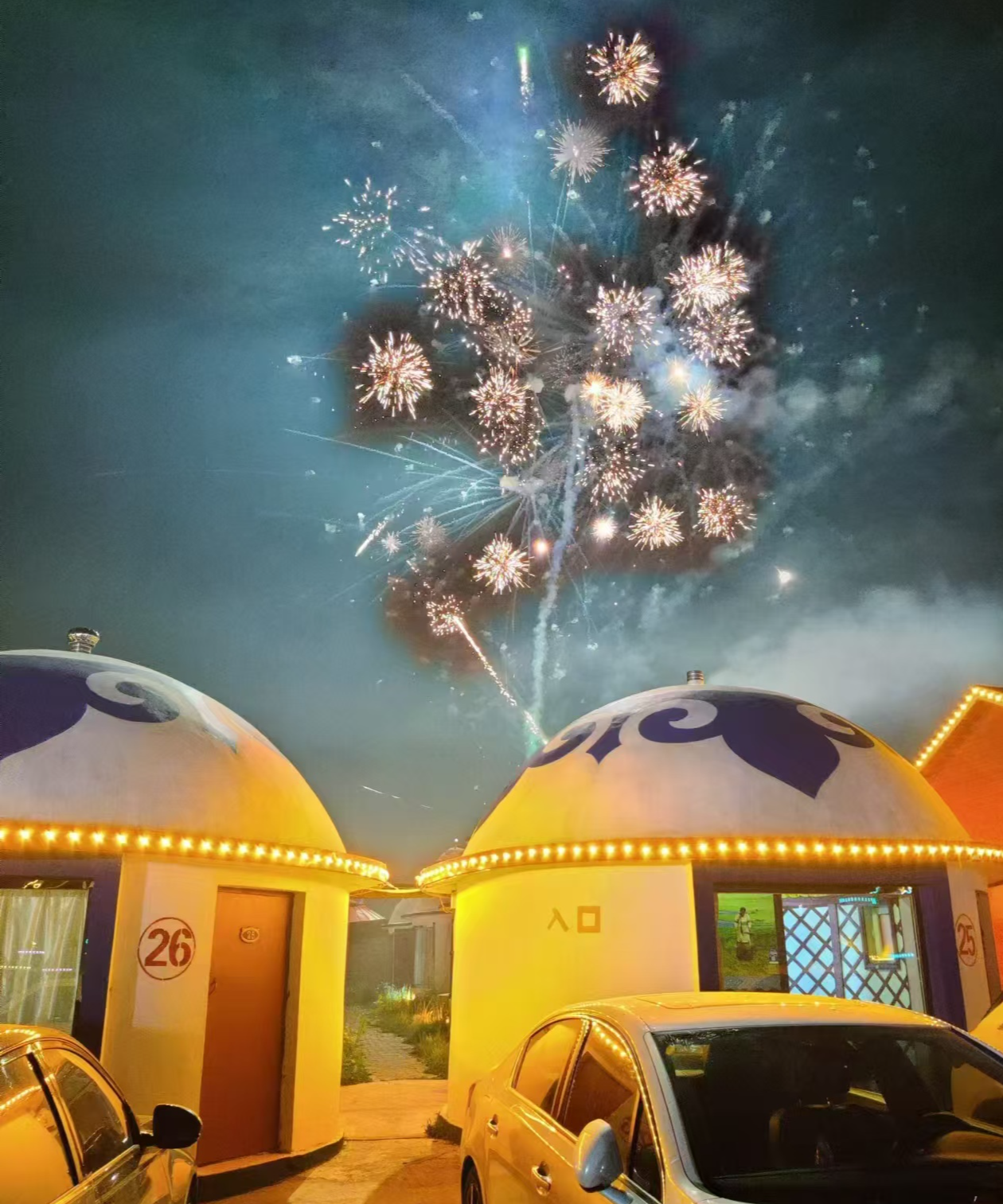 蒙古包外面有个小广场,酒足饭饱后,晚上8、9点钟,每家每户都和着音乐举行篝火晚会,都会邀请游人一起跳起蒙古舞、唱起蒙古歌,燃放五颜六色的烟花,如果您有兴趣,还可以放开歌喉高歌几曲,像过节一样非常热闹,这也是草原上草原人无忧无虑的富足生活!