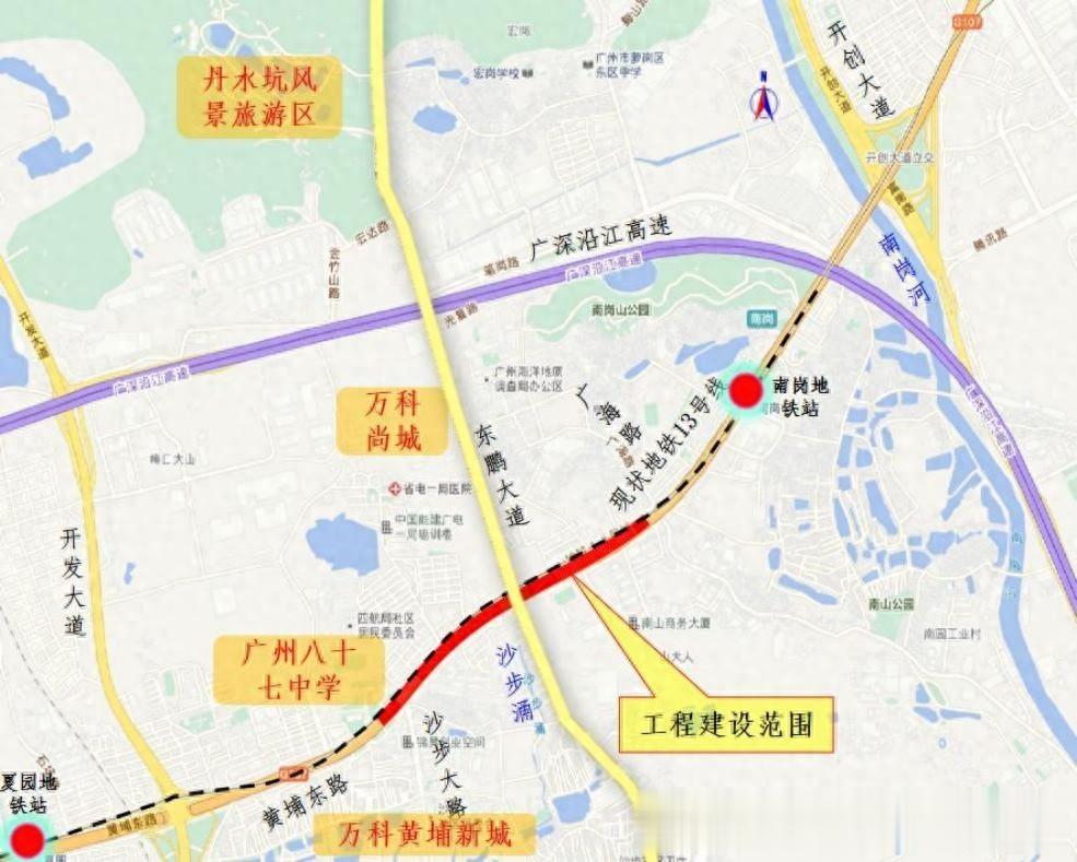 黄埔东路快速化改造工程(东鹏大道隧道)项目主要建设内容为主要是对黄埔东路下穿东鹏大道南延线节点进行改造,采用主线隧道下穿+辅道地面平交形式,工程线位局部往南适当偏移避开现状地铁13号线,两端接顺现状黄埔东路。