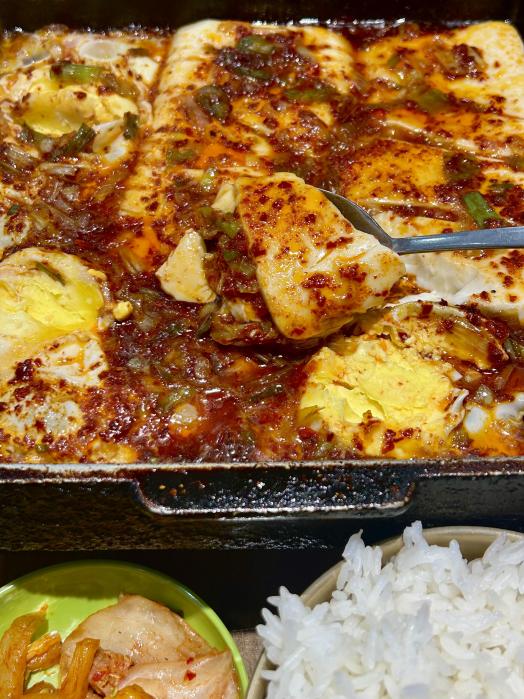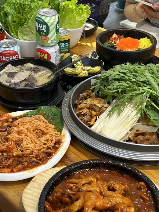 石锅拌饭端上来滋滋作响,锅底锅巴香脆,多种蔬菜搭配秘制辣酱,拌匀后每一口都裹着食材;辣白菜五花肉拌饭咸辣鲜香,五花肉肥而不腻。