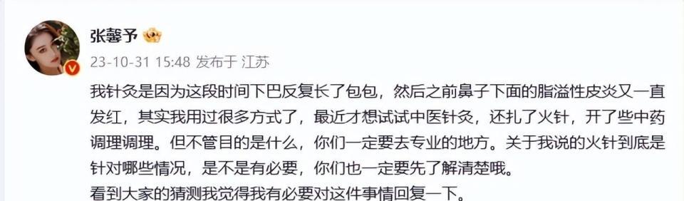 她发文称:“我针灸是因为这段时间下巴反复长了包包,然后之前鼻子下面的脂溢性皮炎又一直发红,其实我用过很多方式了,最近才想试试中医针灸,还扎了火针,开了些中药调理调理。但不管目的是什么,你们一定要去专业的地方。关于我说的火针到底是针对哪些情况,是不是有必要,你们也一定要先了解清楚哦。看到大家的猜测我觉得我有必要对这件事情回复一下。”