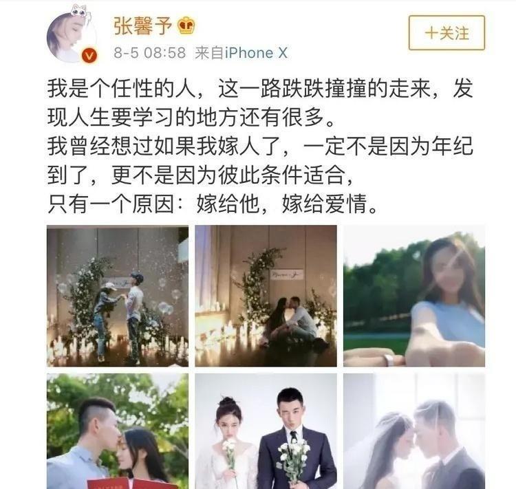 张馨予和老公何捷通过综艺节目《奇兵神犬》相识;2018年8月5日,张馨予晒照宣布结婚,男方正是武警军官何捷;2018年8月,张馨予何捷在上海办婚礼。