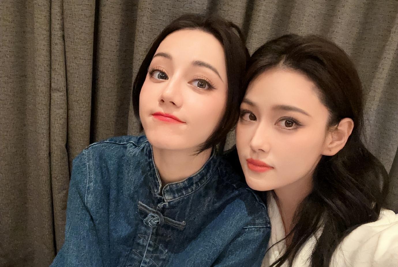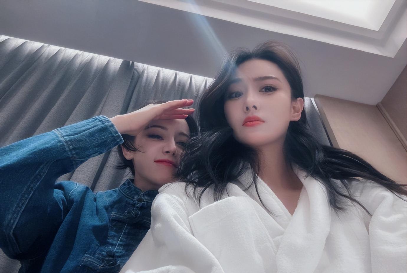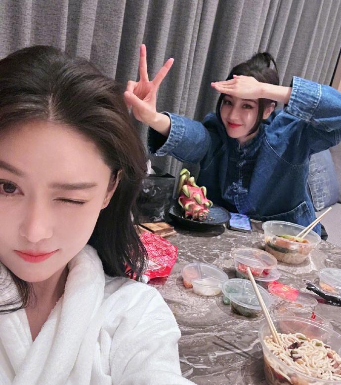 合照中,迪丽热巴穿蓝色牛仔衣妆容精致,红唇迷人,捂脸比V摆出各种搞怪表情;张馨予穿白色浴袍,俏皮眨眼wink,十分随性。