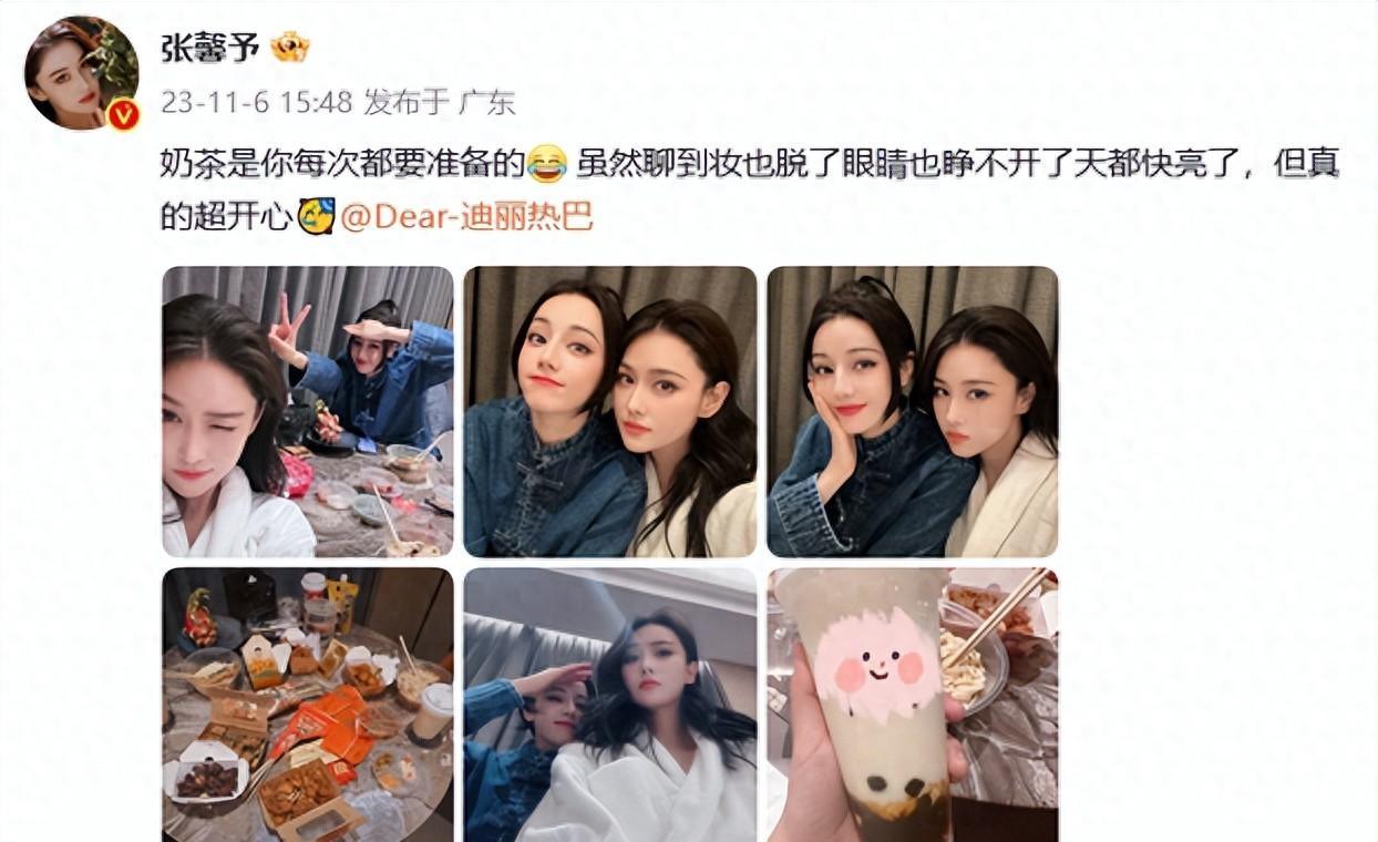 11月6日,女演员张馨予罕见晒出多张和迪丽热巴的搞怪合照,大秀闺蜜情。