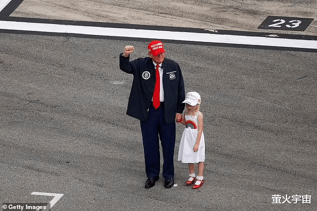 走下车后,特朗普拉着孙女的手,接受现场观众的欢呼,他也举起了拳头回应着。