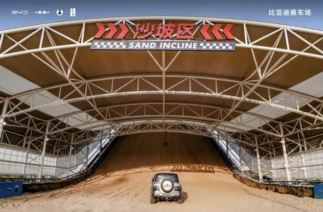 全速好玩尽在比亚迪赛车场,其中沙地冲坡区打破“最大、最高冲沙测试场”吉尼斯纪录,坡面垂直高度29.6米,28°坡度配6200吨细沙,无需远赴阿拉善就能体验冲坡的刺激。顶部300㎡观景台更配备空调座椅,让观众舒适观赏“沙漠冲坡”的震撼。