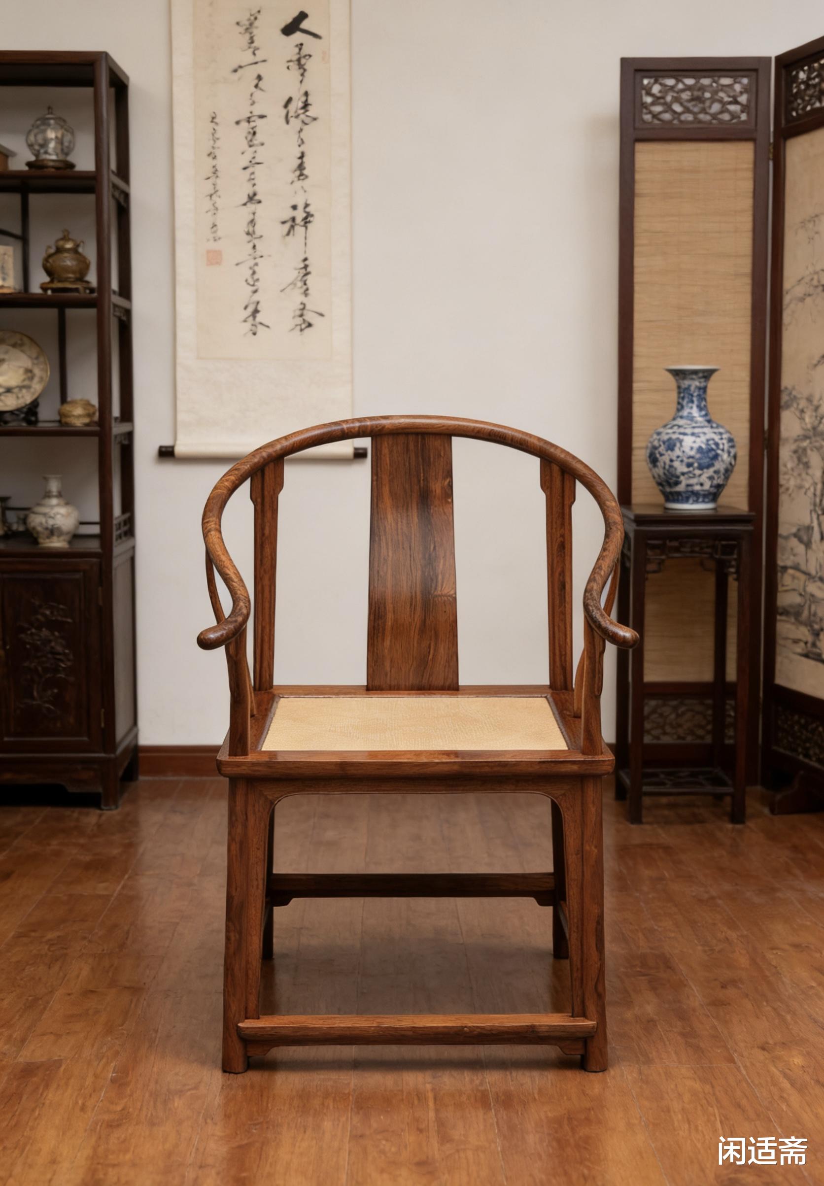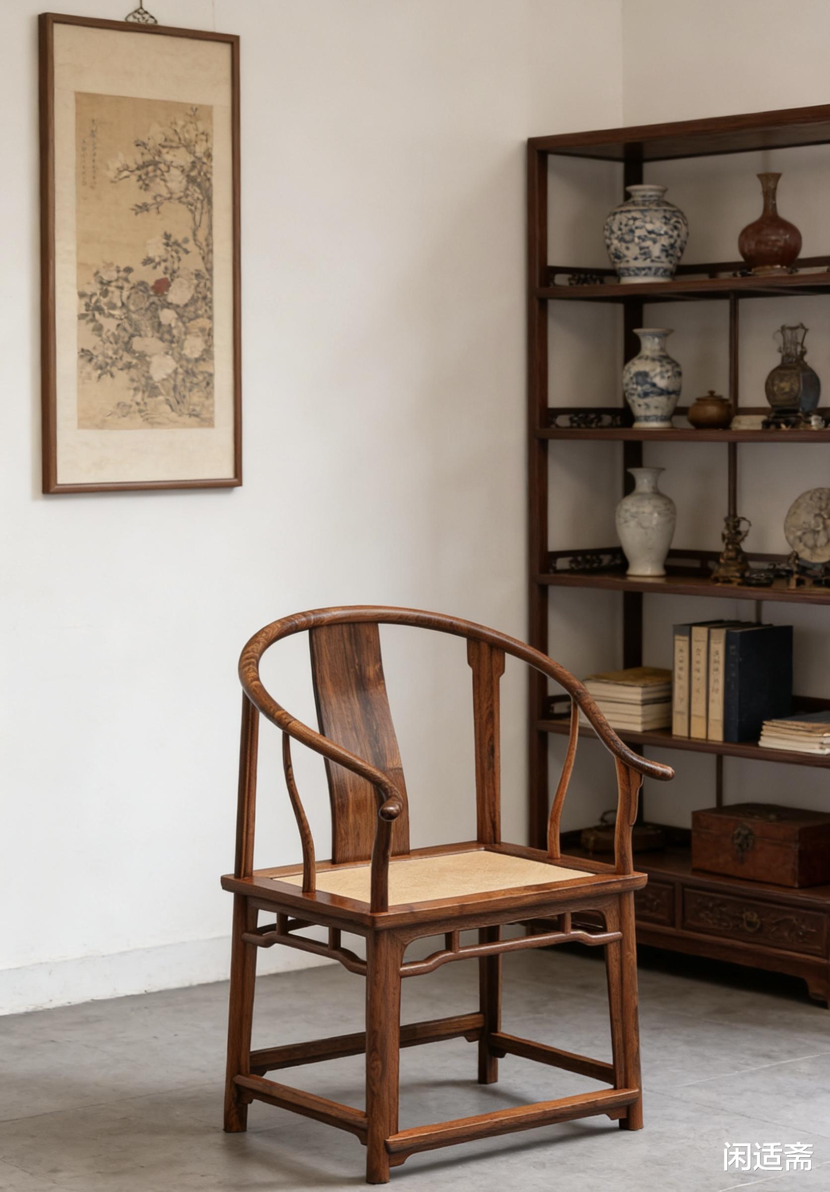 它以圆润流畅的圈形扶手为核心,搭配方正的椅座与腿足,暗合“圆为天、方为地”的哲思,既有着东方器物的含蓄内敛,又兼具舒适实用的特质,线条简约而不简单,气韵雅致而不张扬,是中式家具中彰显格调与文化底蕴的经典品类,是明式家具“材美工巧、形神兼备”的典范之作。