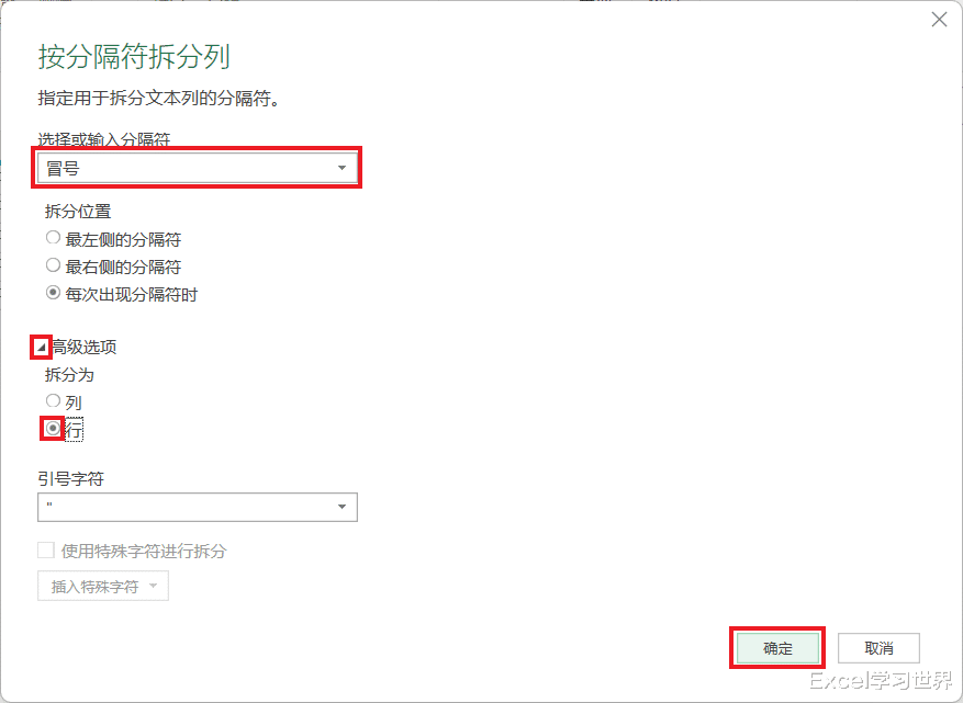 10. 在弹出的对话框中已经默认选择了“冒号”作为分隔符,点开“高级选项”--> 选择“行”--> 点击“确定”