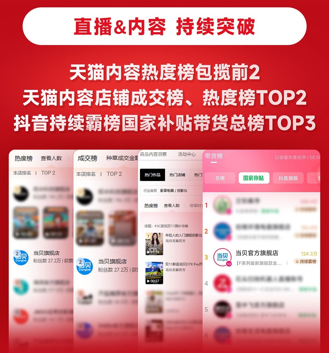 天猫平台,当贝包揽内容热度榜第1、第2,成为消费者关注度最高的投影品牌之一;同时还斩获了天猫内容店铺成交榜、热度榜TOP2。
