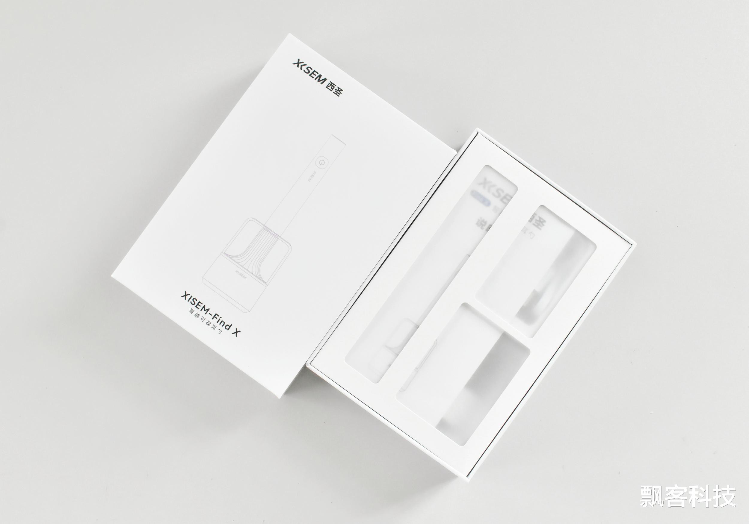 打开包装盒,作为一款精密的耳道护理清洁工具,里面的吸塑隔层采用了分区格子的设计。包装内容包括西圣Find X智能可视挖耳勺主机、UVC消毒底座、Type-C充电线、说明书/合格证、耳勺头、耳铲头、耳钩头等,在消毒座底盒内还收纳了8个硅胶耳勺套。