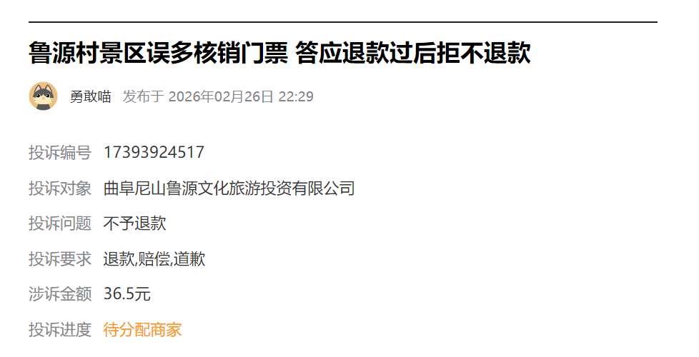近日,有网民在黑猫投诉平台发起投诉,称在鲁源村景区游玩期间,遭遇门票被误多核销、景区承诺退款却迟迟未兑现的问题,此次涉事金额为36.5元,截至目前,该投诉仍在处理当中。