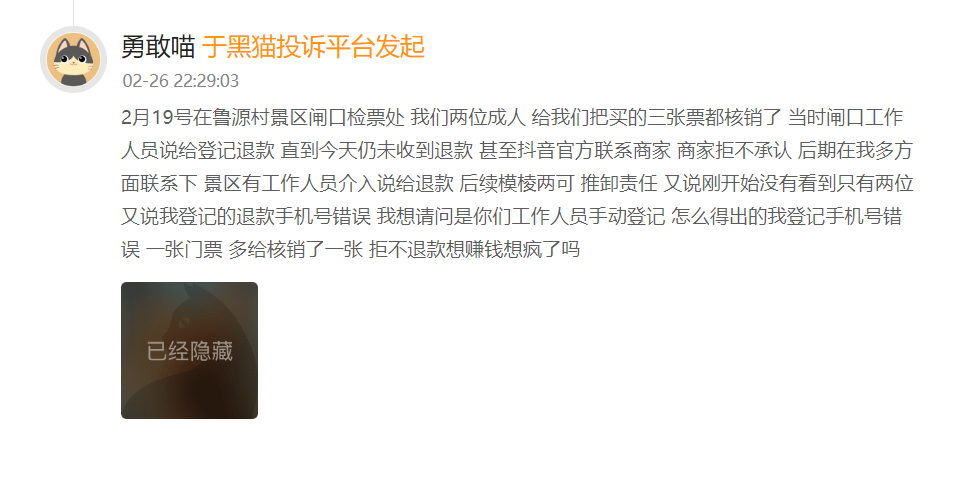 据投诉人讲述,2月19日,他与同伴共两位成人一同前往鲁源村景区游玩,可在闸口检票环节,景区工作人员不慎出现操作失误,将他们购买的三张门票全部核销,发现这一问题后,投诉人第一时间与闸口工作人员沟通,对方当即承认了自身操作失误,并现场表示会登记相关信息,为其办理多核销那张门票的退款手续,还让投诉人先安心游玩。可让投诉人没想到的是,这份口头承诺并未如期兑现。从游玩当日起,一直到他发起投诉,始终没有收到这笔36.5元的退款。期间,他也曾尝试通过抖音平台介入协调联系景区,但仍未果。
