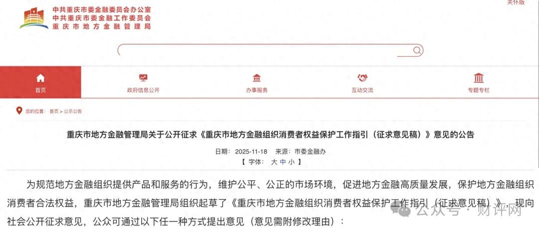 声明:《征求意见稿》来源于重庆市地方金融管理局,本文内容旨在进行政策研究与行业分析,所载观点仅为作者基于公开信息的个人理解与评论,不代表任何机构立场,也不构成任何投资或操作建议。笔者力求内容准确、客观,但疏漏之处在所难免,敬请读者批判性参考。本账号主体非新闻媒体机构。转载请联系作者,并请注明出处。