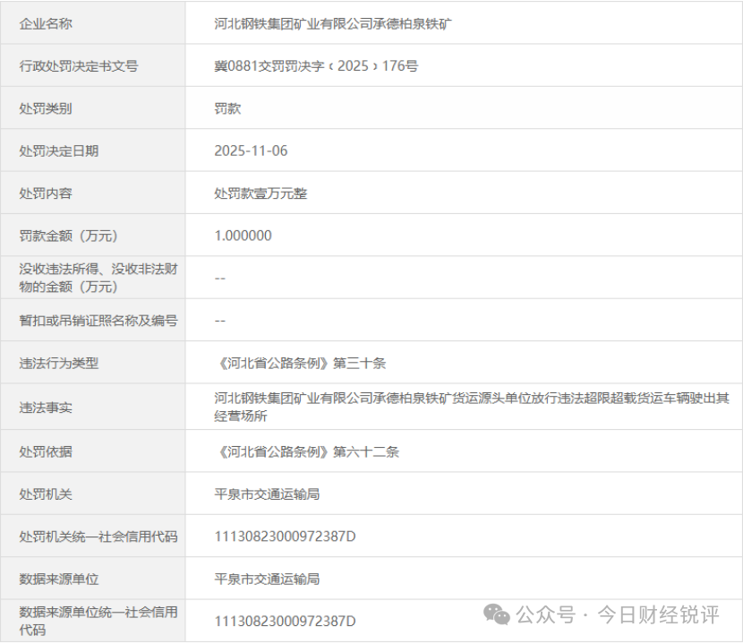 近日,平泉市交通运输局对河北钢铁集团矿业有限公司承德柏泉铁矿作出行政处罚,该企业因存在货运源头单位放行违法超限超载货运车辆驶出经营场所的违法行为,被依法处以1万元罚款,行政处罚决定书文号为冀0881交罚罚决字﹝2025﹞176号。