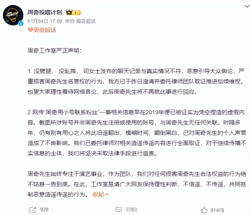 但向女士一直没有对两人的恋情做出回应,聊天内容被曝光后,男方发表了声明 。