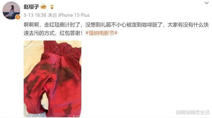 果不其然没多久,她就在自己的社交账号说自己的红色礼服已经被咖啡给弄脏了,希望网友能够给自己提意见,看看能不能去污?