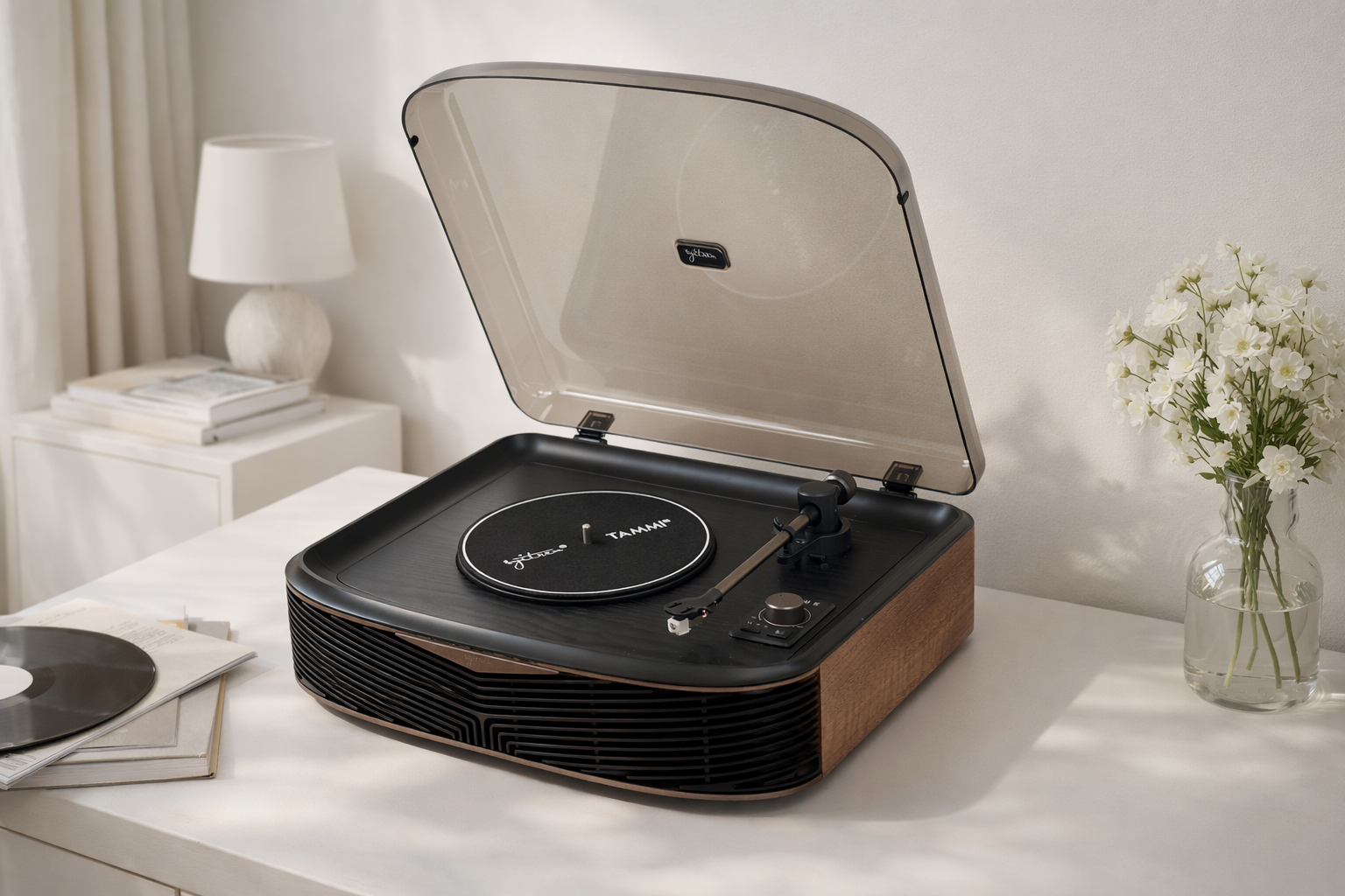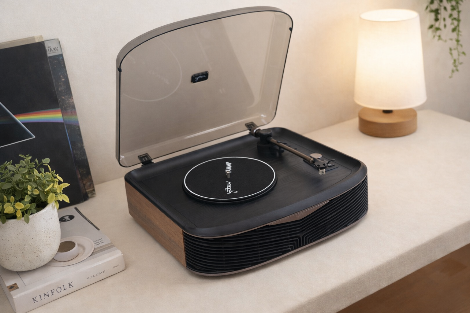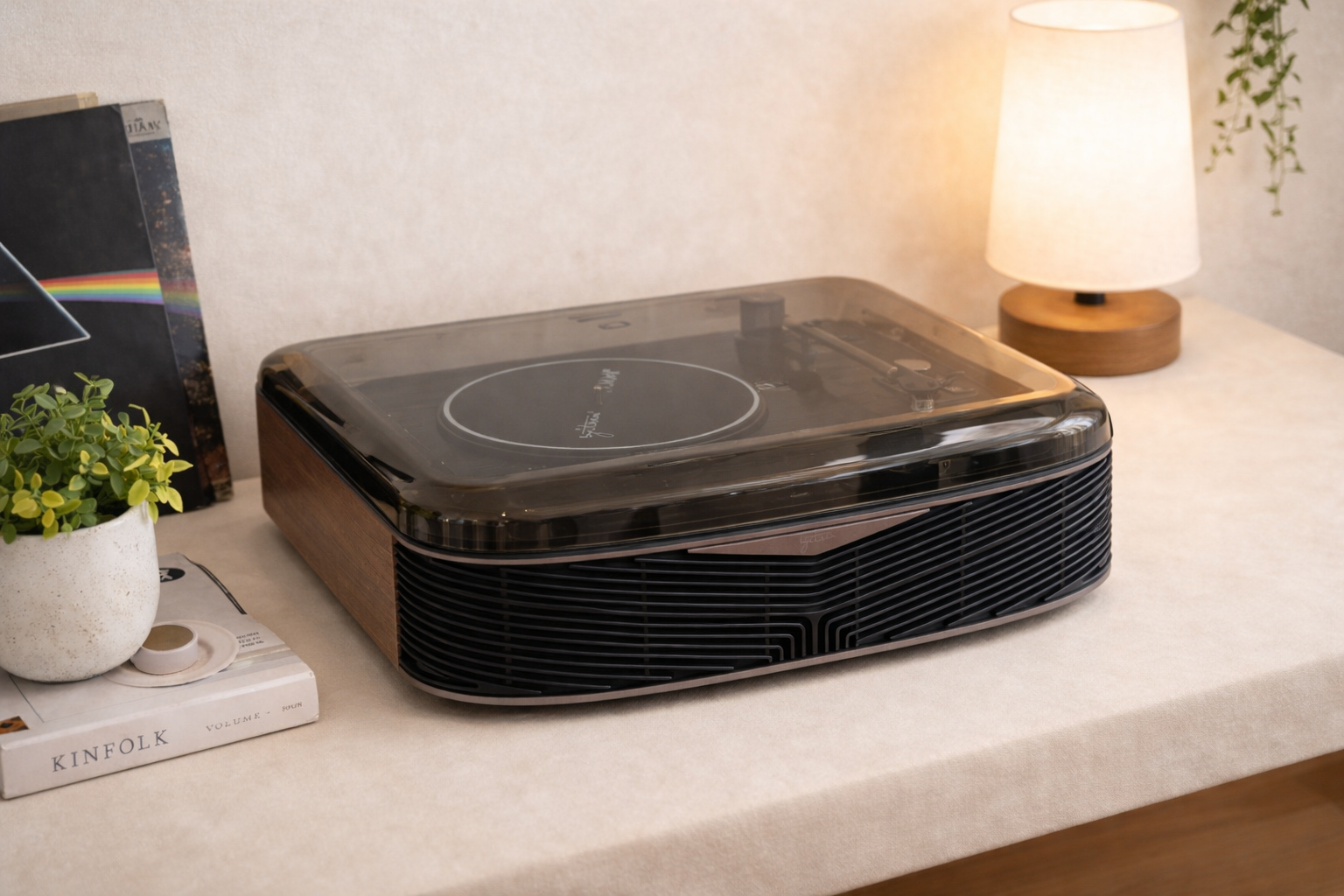 Tammi给人的第一印象,跟市面上很多走复古软装路线的黑胶机不太一样。很多黑胶唱片机现在都在强调温柔、圆润、奶油感,适合放在ins风或者偏柔和的家居环境里,但Tammi的气质会更硬朗一点。它的线条是比较利落的,没有太多刻意做旧的处理,木纹也不是那种特别浮夸的复古感,而是更克制一些,看着有温度,但不会过分文艺。放在客厅、书房、卧室都挺顺,不会显得太突兀,尤其是跟现代一点的家具搭在一起,反而有种刚刚好的反差。