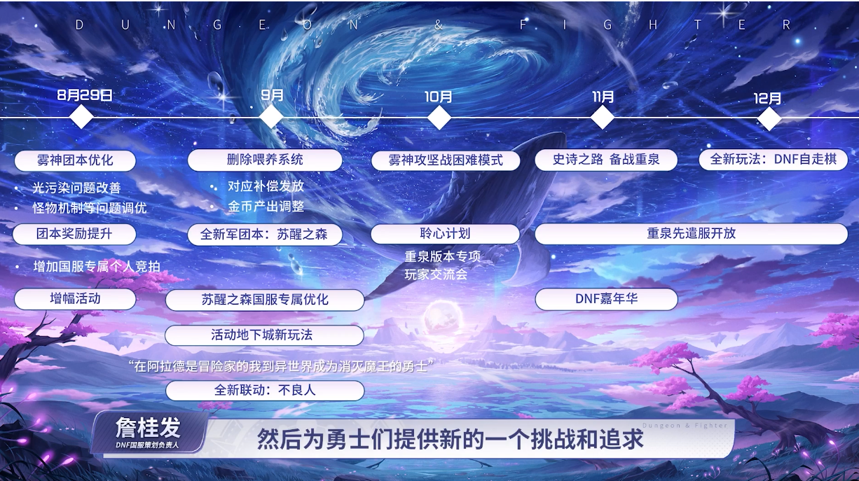 除了删除喂养和自定义外,在2025年的1月,国服还将与韩国DNF同步更新上线120级重泉版本,国服总算不再慢韩服一个版本。在重泉版本中,除了上面所提到的全新装备,还会有新的技能搭配要素,以及一个代替护石、符文和CP武器的新系统,以此给各大职业提供新的玩法体验。
