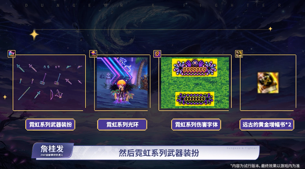 每一次聆心计划都会给大家发放特别快递,这一次也不例外,在8月29日后登陆游戏就可以领到1个三觉装扮自选、霓虹系列武器装备、光环、伤害字体,以及两本远古的黄金增幅书,其中这个霓虹武器是之前韩服周年庆送的装扮,还怪好看的。