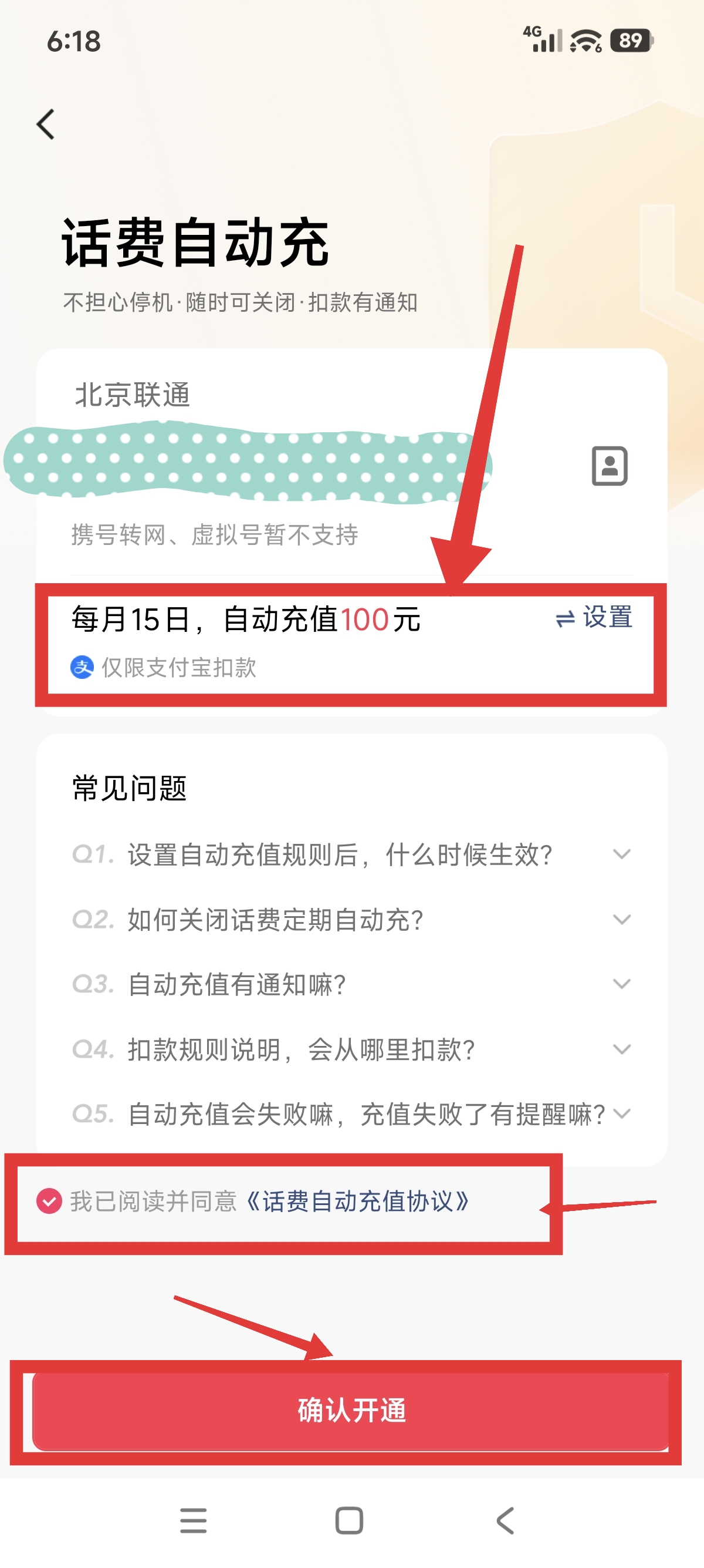 6.到话费自动充页面后,设置每月支付宝扣款,勾选(我已阅读并同意),然后点击(确认开通)按钮即可了。