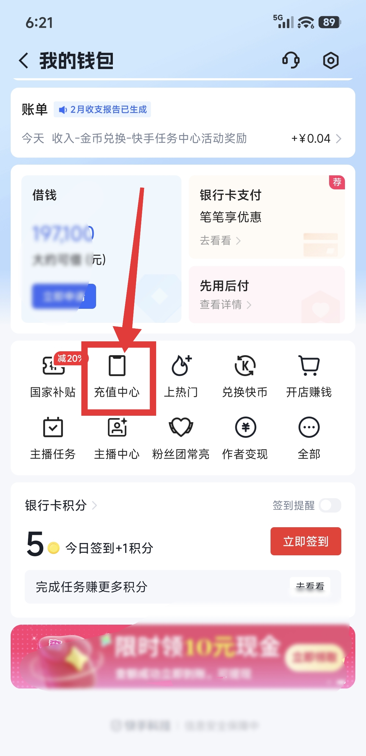 4.进入到我的钱包页面后,点击(充值中心)。