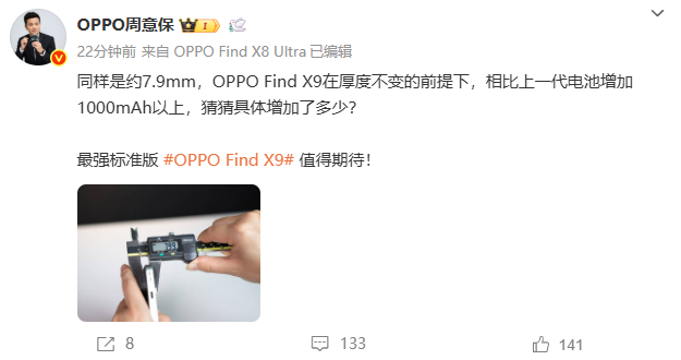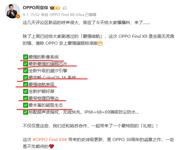近日,绿厂高管@OPPO周意保 曝光了OPPO Find X9的信息,其中用了6个“最”来高调预热:①最强的影像系统;②最新最强的旗舰芯片;③最流畅ColorOS 16系统;④最强续航表现;⑤最窄物理四等边;⑥最丰富的磁吸生态。并直言它将是OPPO史上最强旗舰标准版。