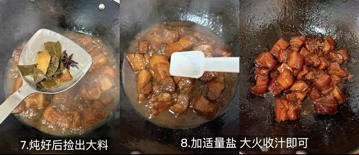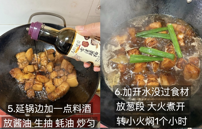 调味和焖煮,是让风味渗透进每一丝肉纹的过程。先倒入两勺古法头抽提鲜,一勺料酒去腥,一勺蚝油增润,再放少许老抽调色,翻炒均匀后,加入葱姜、八角、桂皮和香叶,让香料的气息慢慢融入酱料里。接着一定要一次性加足开水,水量要没过所有肉块,大火烧开后转最小火,盖上锅盖焖煮50分钟。这期间不用开盖翻动,让温度和时间慢慢软化肉质,让头抽的鲜、香料的香、猪肉的甜在汤汁里充分融合,每一分钟都在为最后的美味蓄力。