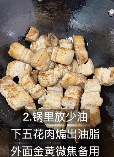 煎肉是让红烧肉不油腻的关键一步。锅里不放一滴新油,直接倒入沥干的五花肉,中小火慢慢煎,看着肉块表面从粉嫩变得微黄,油脂一点点渗出来,整个厨房都飘起淡淡的肉香。等边缘微微焦脆时,把肉块盛出来,锅里留少许底油,这部分猪油是炒糖色的绝佳基底,比植物油更能增香提味。