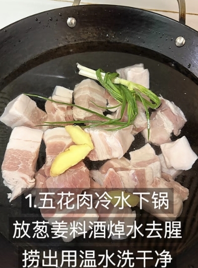 处理五花肉的步骤,藏着让肉质软烂的小心机。先把五花肉切成麻将大小的方块,太大不易入味,太小容易炖散,这个尺寸刚刚好。冷水下锅,丢进葱段、姜片和一勺料酒,大火煮开,撇去表面的浮沫,这一步能彻底去掉肉的腥味和血水。焯好的肉块要用温水冲净沥干,千万别用冷水,不然肉质会骤然紧缩,后面再怎么炖都难达到入口即化的口感。